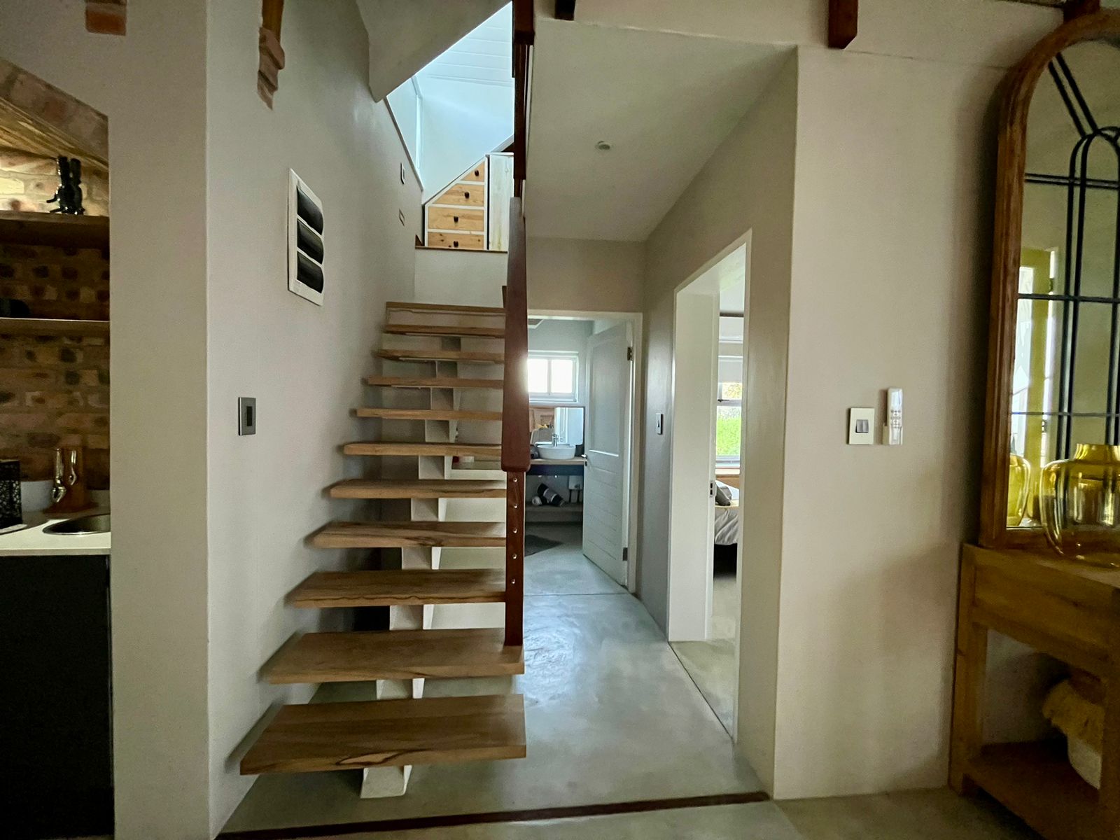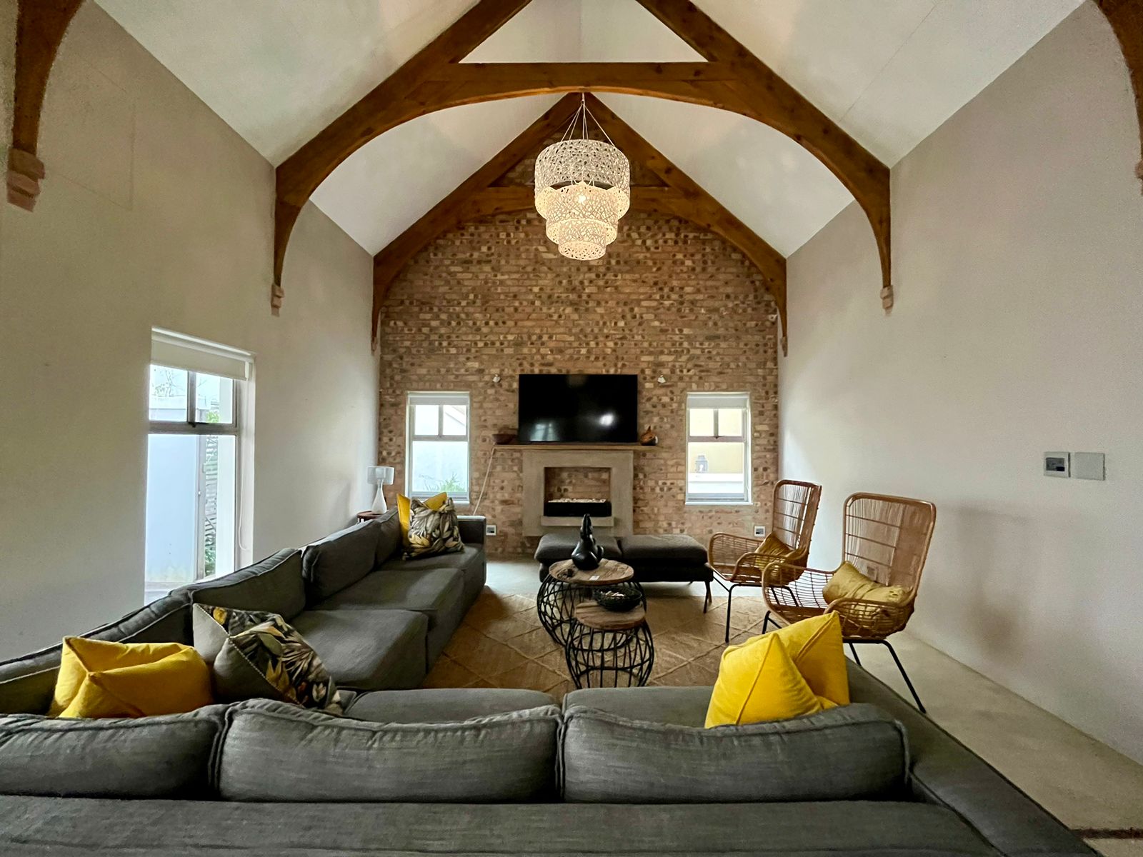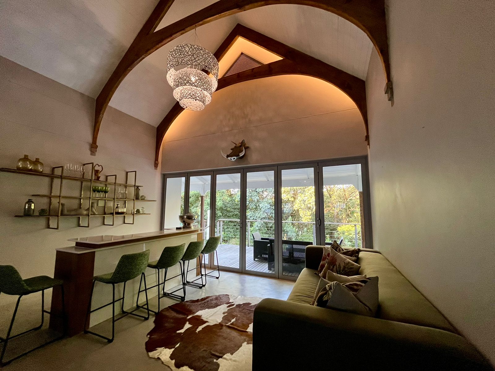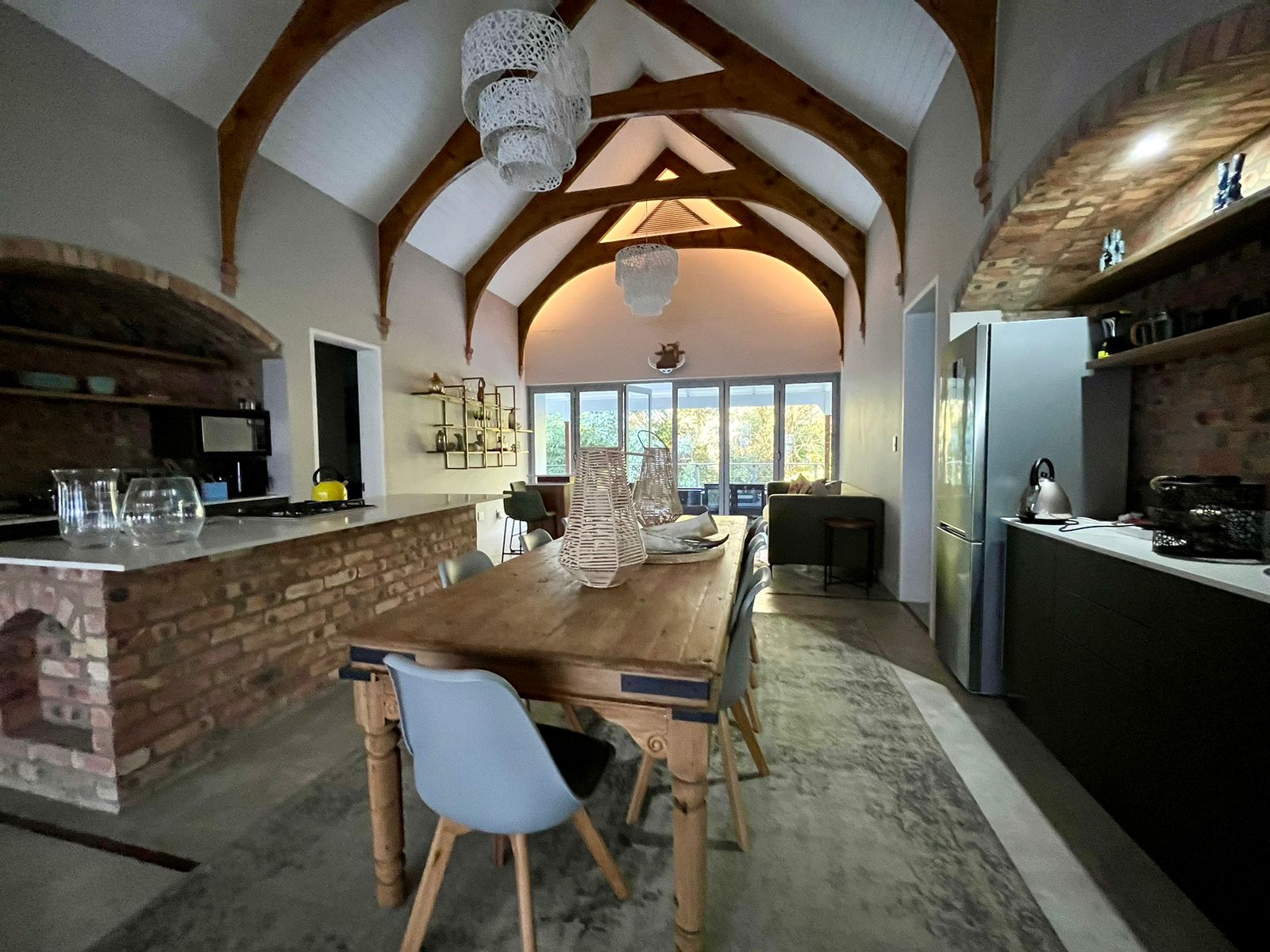 Walk through the large yellow door and experience a unique interior, with large open plan, lounge, dining, kitchen and bar area. Unique high ceilings, beautifully framed with wooden arches. Outside the bar is a balcony overlooking the garden with a large swimming pool and fire pit.