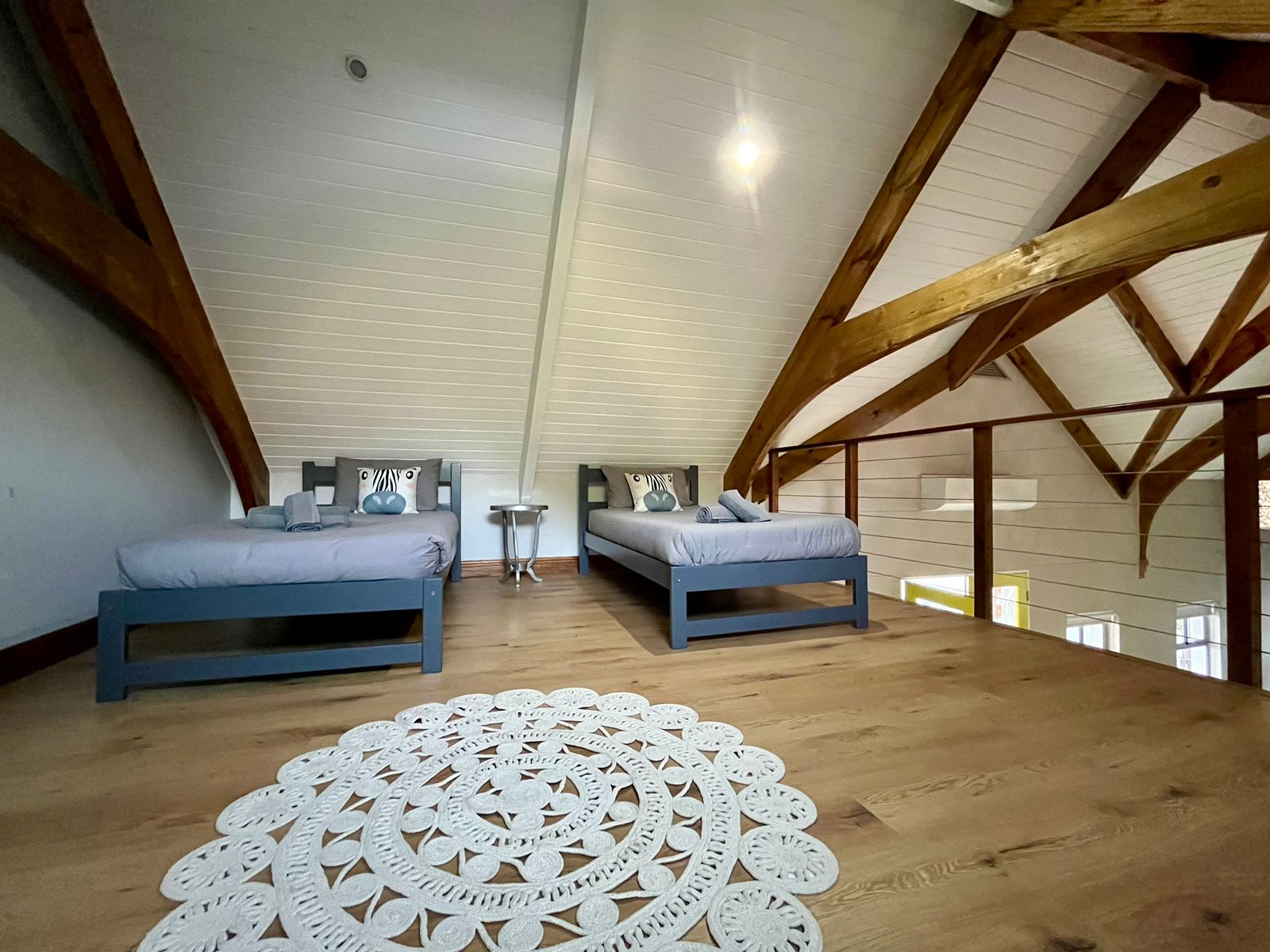 Three bedrooms are on the same level as the large open plan area. Two bedrooms with king size beds have en-suite bathrooms, One bedroom with two single beds shares a bathroom with a loft room which is up the stairs, overlooking the lounge area. This cute room has two single beds.